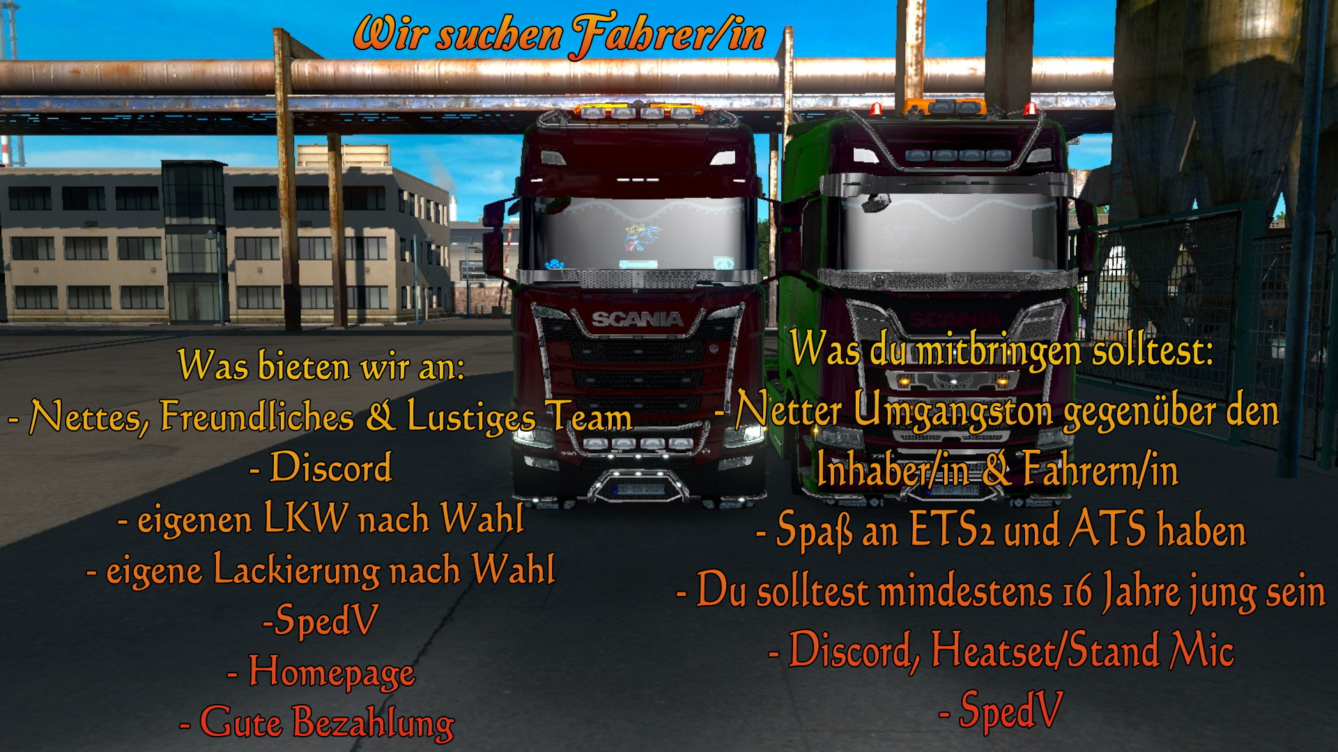 Als erfahrene virtuelle Spedition innerhalb von Euro Truck Simulator 2 (ETS2) und American Truck Simulator (ATS) bieten wir engagierten Fahrern eine professionelle und freundliche Gemeinschaft. Unsere Mitglieder profitieren von einem strukturierten Frachtmanagement, regelmäßigen Konvois und einer aktiven Organisation, die Fahrspaß und Teamgeist in den Mittelpunkt stellt.